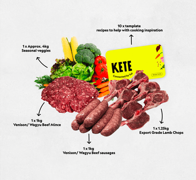 This value-packed bundle combines 3kg of premium venison/Wagyu beef mince, sausages, and lamb chops* with a generous selection of fresh, seasonal vegetables like potatoes, carrots, onions, broccoli, cabbage, and more. Everything you need in one convenient box for balanced, wholesome meals.